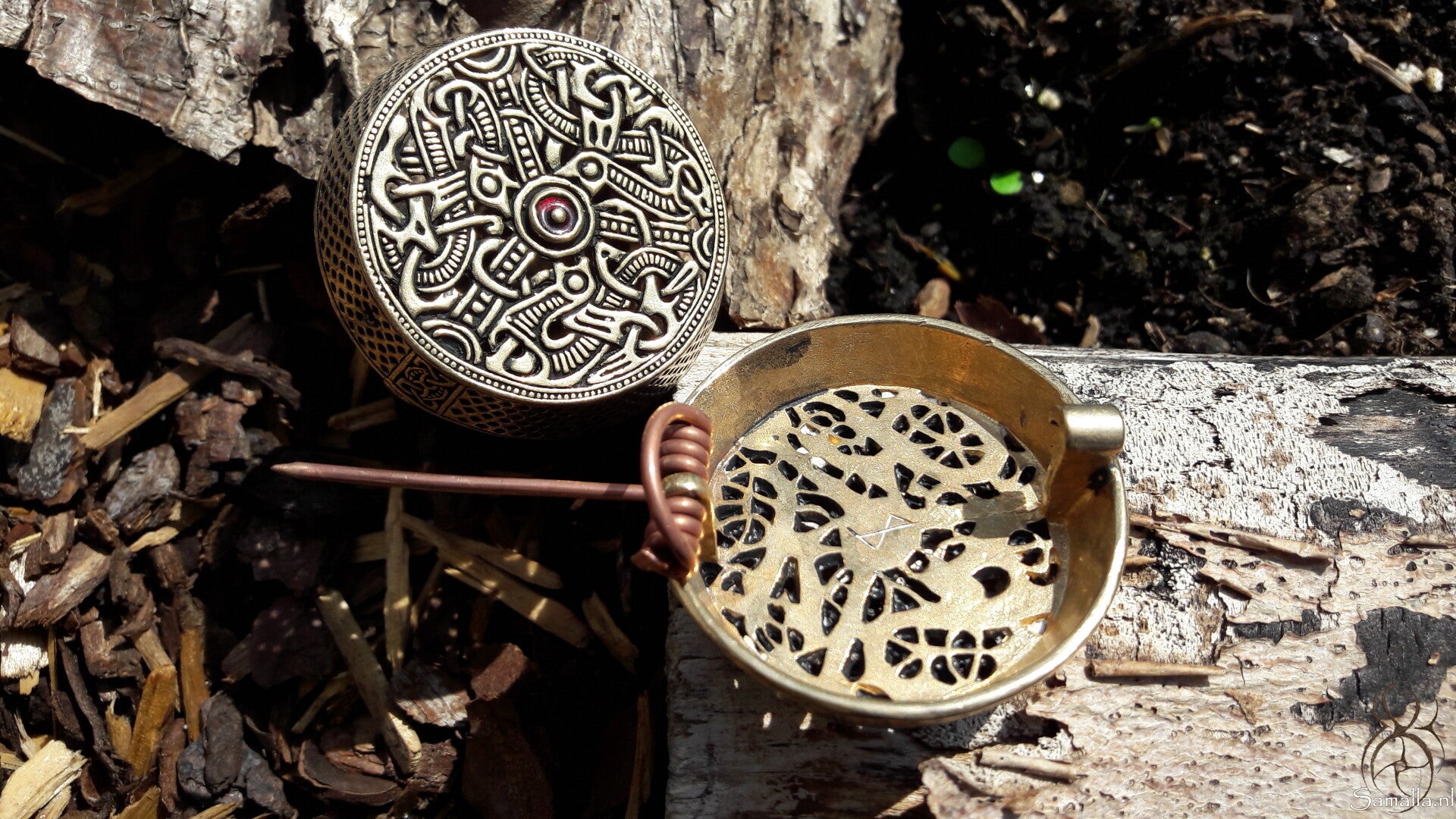 Gedetailleerde replica van een kleine doosbroche uit de Vikingtijd , gebaseerd op een origineel uit Gotland uit de 8e-9e eeuw en versierd met drie gestreepte dieren in de zogenaamde Dierstijl III volgens Salin.